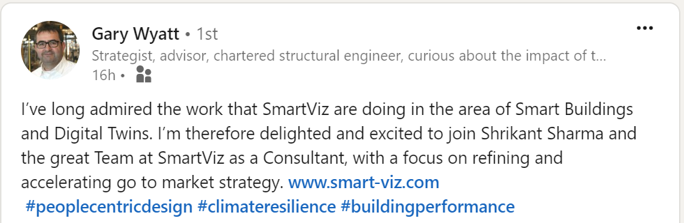 Gary’s deep understanding of the AEC market and technologies, coupled with his commitment to people-centric design and climate resilience, makes him a perfect fit for SmartViz. We’re excited about the new heights we will achieve together in building performance and sustainability.