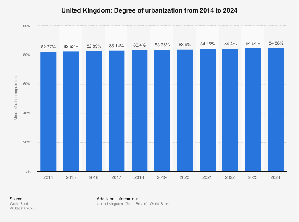 An example of this is the degree of urbanisation in the United Kingdom, which has increased to almost 85% percent in 2023, showing an almost three percentage point increase over the previous decade.