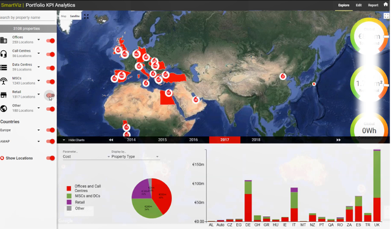 The SmartViz platform presents a single source of truth about assets and people within a 3D visual platform, making it easy to monitor property type, cost, floor space, utilization, staff numbers, and energy usage across Vodafone’s global portfolio of over 3,000 offices, call centers, retail stores, and data centers. Plus, our filterable by countries, regions or cities with live visualization on maps, dials, and charts make it easy for property managers to add and edit data as required. The dashboard provides valuable insights and informs Vodafone’s strategic decision-making.